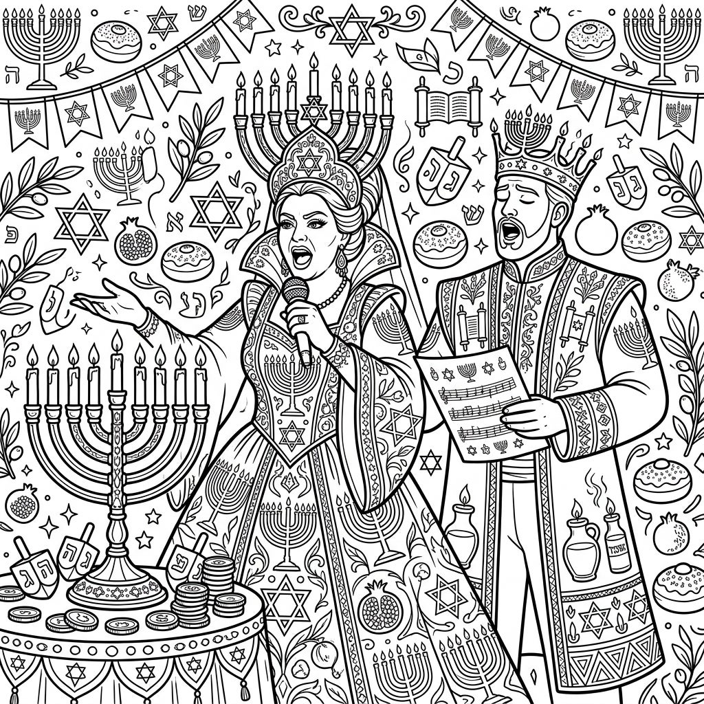 Step into a world where operatic grandeur meets Hanukkah festivity with this richly detailed coloring page. Observe the commanding female opera singer, draped in an exquisite gown adorned with menorah patterns, holding a microphone as she performs. Beside her, a stately male singer, clad in a regal coat featuring Torah scrolls and Stars of David, holds sheet music, both crowned with menorah-inspired headpieces. The entire tableau is a tapestry of celebration, intricately woven with iconic Hanukkah elements like glowing menorahs, spinning dreidels, delicious sufganiyot, and vibrant pomegranates.