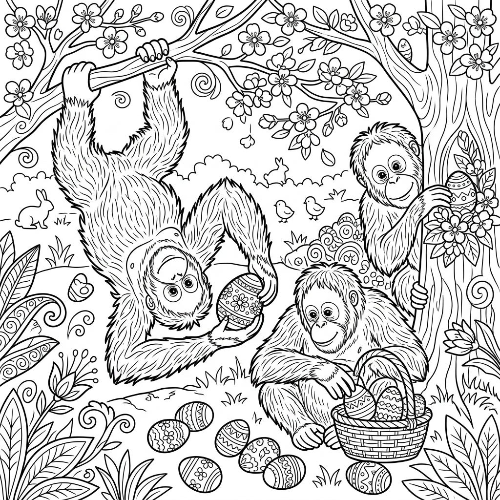 Discover a captivating Easter scene where three adorable orangutans bring a unique twist to spring festivities. In this detailed coloring page, one mischievous orangutan hangs playfully from a cherry blossom-filled branch, clutching a beautifully patterned Easter egg. Another curious orangutan peeks from behind a tree, while a third sits contentedly, surrounded by a charming basket brimming with intricately decorated eggs and several more scattered across the grassy foreground. The entire setting is adorned with delicate spring blossoms, tiny bunnies, and chirping birds, creating a lively and engaging tableau perfect for teen colorists.