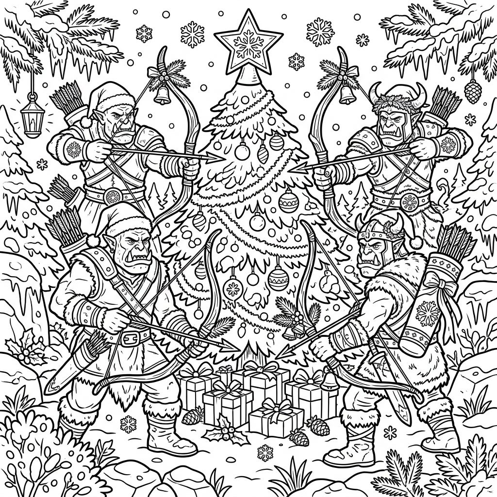 Dive into a richly detailed coloring scene where the fierce world of orc archers meets the festive joy of Christmas! This intricate illustration features four formidable orcs, each equipped with crude yet effective bows and quivers full of arrows, poised for a holiday skirmish. They're adorned with unique festive touches, from Santa hats and horned helmets embellished with holly to fur-trimmed armor. Dominating the center is a beautifully decorated Christmas tree, laden with ornaments and topped with a star, surrounded by carefully wrapped presents, pinecones, and delicate snowflakes falling amidst snow-covered evergreen branches. Every inch of this page is packed with engaging elements, offering a truly immersive coloring experience.