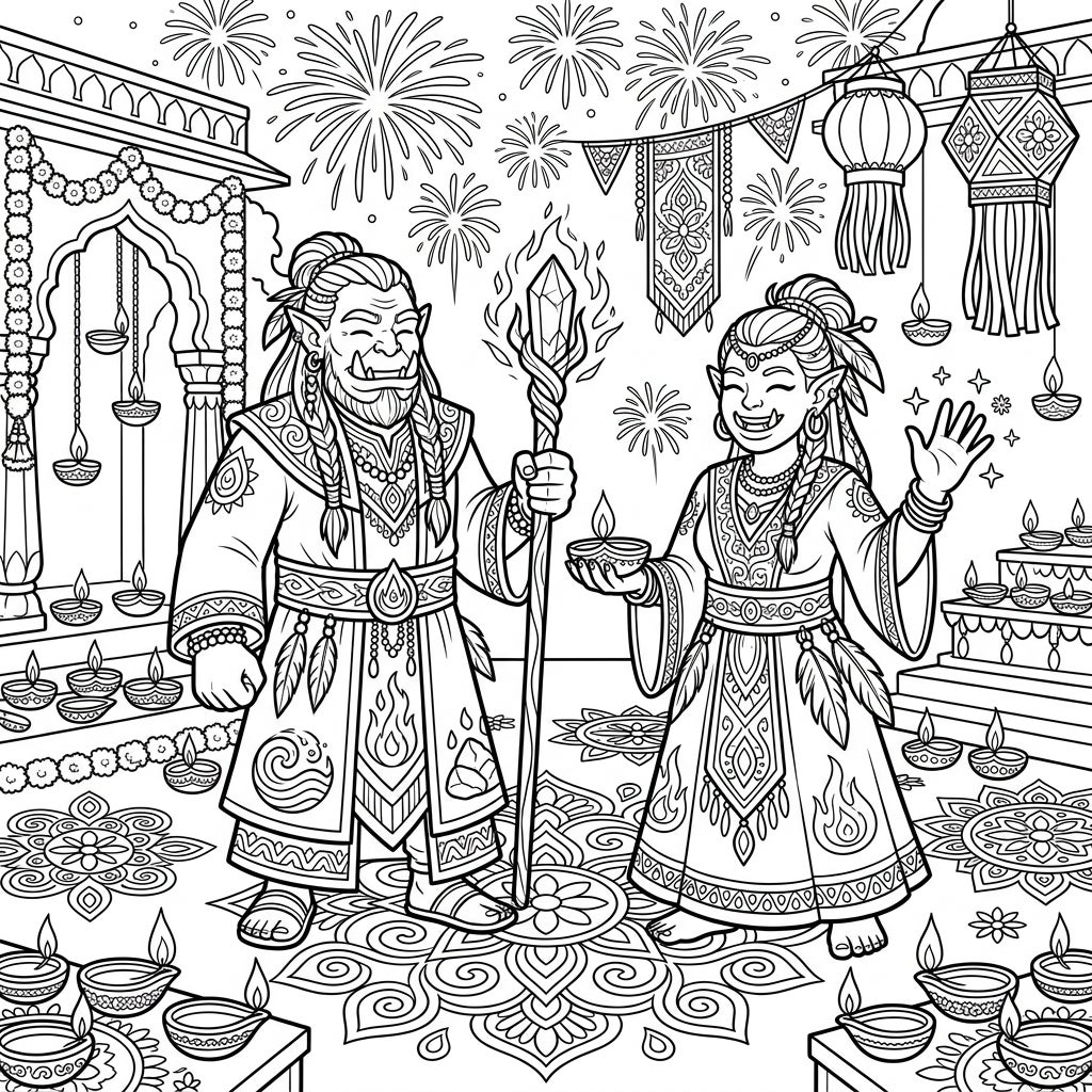 Discover a truly unique fusion in this coloring page, featuring two benevolent Orc Shamans immersed in the joy of Diwali. The male shaman, with his braided beard and powerful staff adorned with a crystal, stands beside a beaming female shaman, both clad in richly detailed robes. Surrounding them are countless traditional diyas, intricate rangoli patterns on the ground, and ornate lanterns hanging from an elaborate archway, all under a sky bursting with celebratory fireworks.