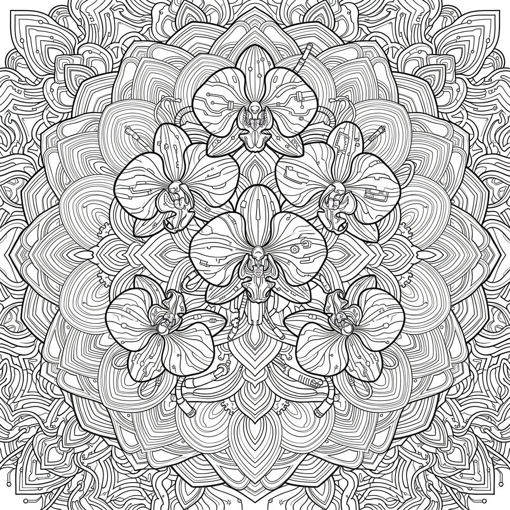 Unleash your creativity with this stunning coloring page featuring intricate orchid mandalas infused with a futuristic cyberpunk aesthetic. Discover a world where organic beauty intertwines with high-tech details, perfect for a unique coloring adventure.