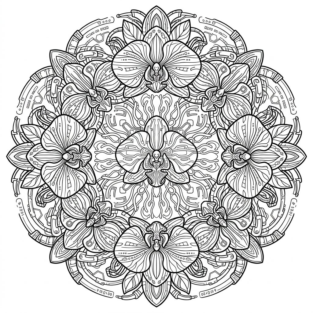 Prepare your favorite coloring tools and let your creativity take flight. Experiment with vibrant, electric colors to make the cyberpunk elements pop, perhaps using cool blues, purples, and greens to simulate neon glow, even if the lines themselves are purely structural. For the orchids, consider rich, exotic hues or metallic shades to emphasize the futuristic theme. With no large empty spaces, every inch of this detailed mandala offers an opportunity for meditative focus and artistic expression. Download, print, and begin your journey into this extraordinary realm.