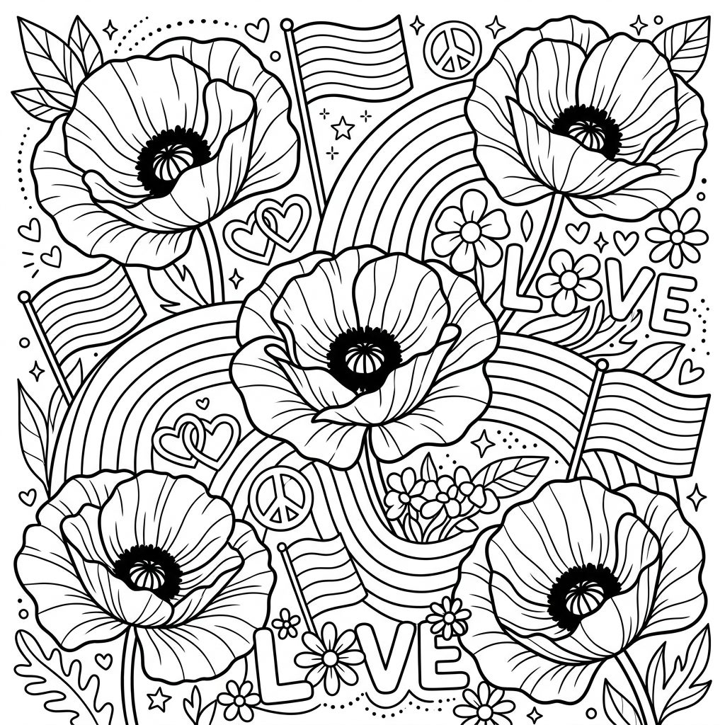 Let your imagination bloom as you choose your palette for this special design. Experiment with traditional rainbow colors for the flags and arches, or get creative with a unique spectrum that reflects your personal style. Consider vibrant reds, oranges, and yellows for the poppy petals, contrasting with deep purples or blacks for their centers. Don't forget the small stars and decorative elements – a touch of glitter or metallic pens can make them truly sparkle! This page offers endless possibilities for expressing your artistic flair and celebrating what truly matters.