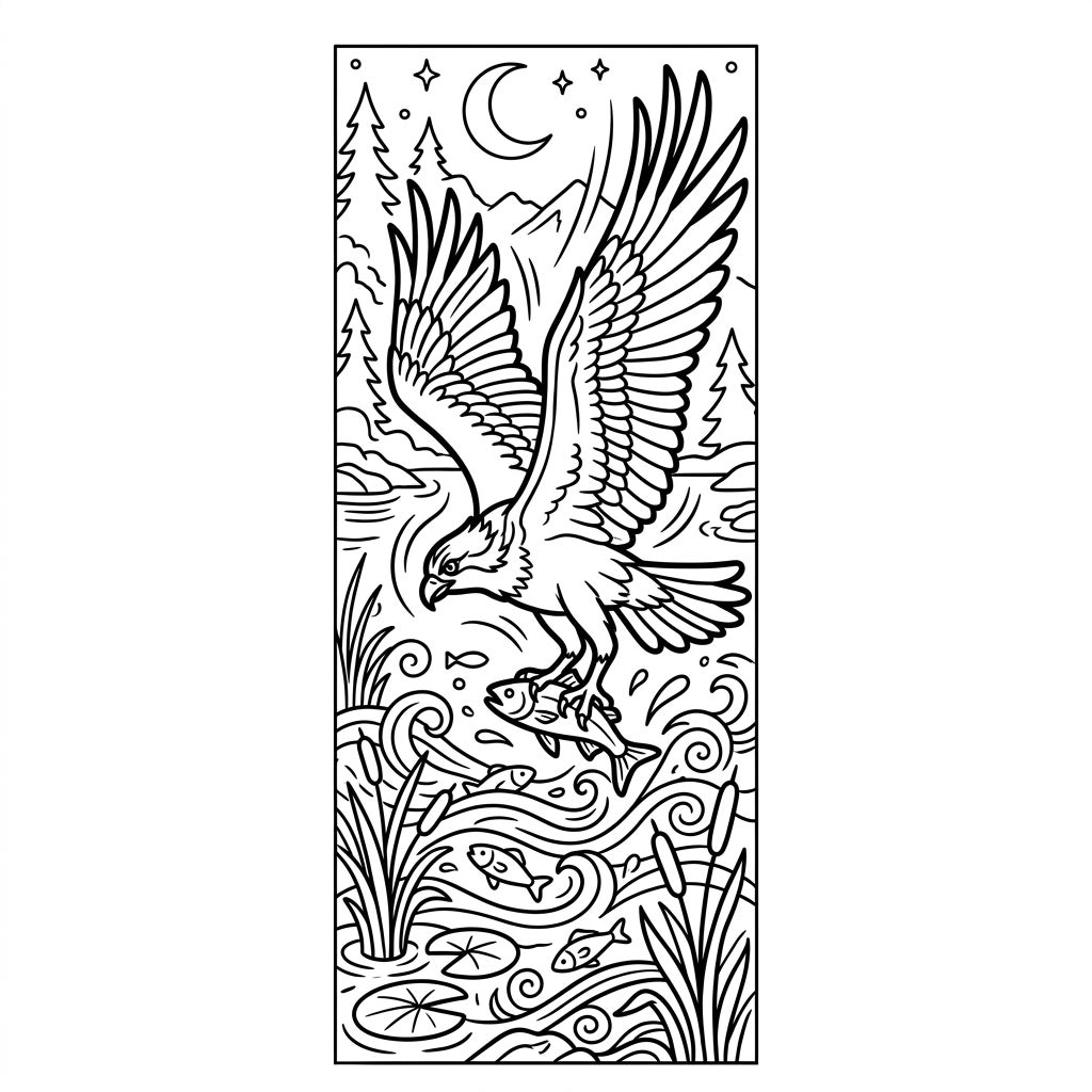 This intricate bookmark coloring template presents a breathtaking moment in nature: a powerful osprey soaring above a tranquil lake, its talons firmly grasping a freshly caught fish. The detailed line art captures the bird's outstretched wings and focused gaze with precision, set against a backdrop of majestic mountains and towering pine trees. Below, the water teems with swirling patterns, delicate lily pads, and tall reeds, all under the soft glow of a crescent moon and twinkling stars, offering a comprehensive and engaging scene for teen colorists.