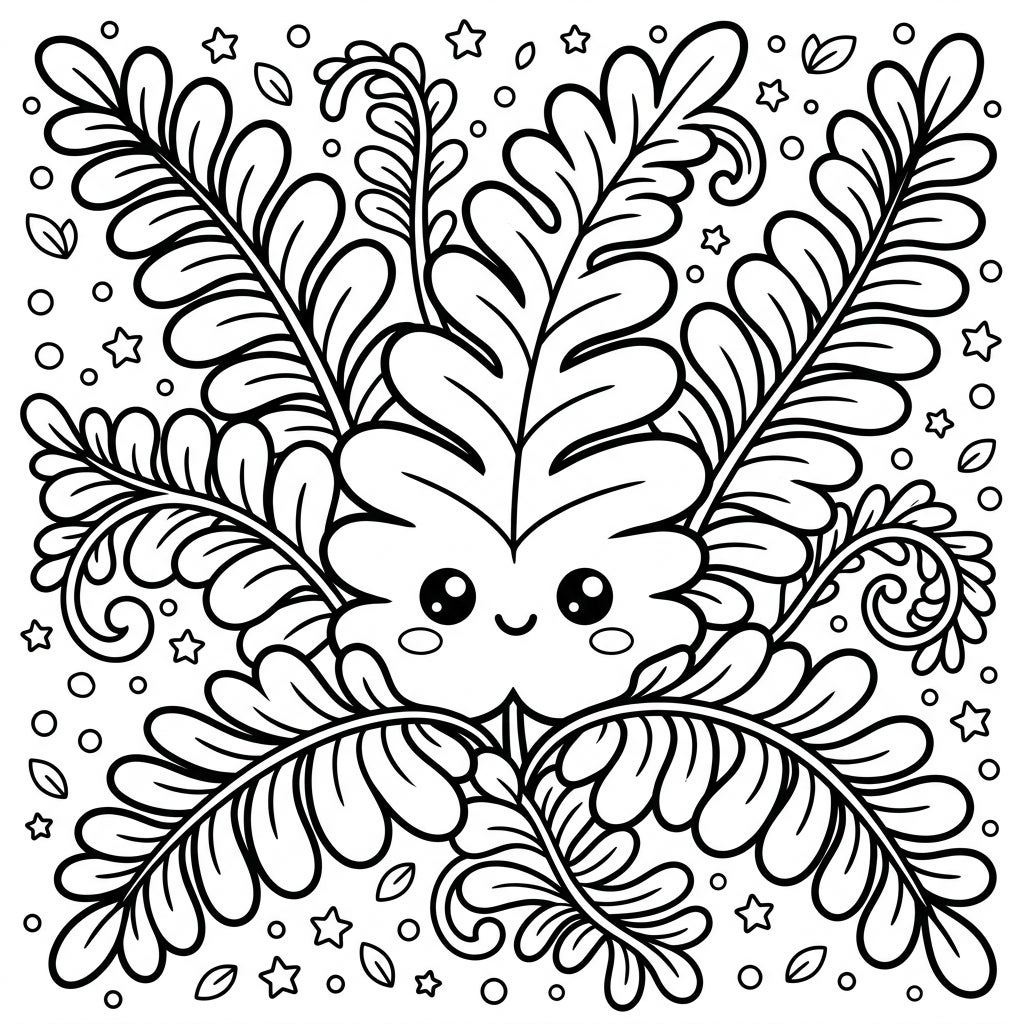 Dive into the enchanting world of nature with our adorable Ostrich Fern coloring page! This delightful illustration brings a classic fern to life with the irresistible charm of Kawaii style. Featuring a sweet little face with sparkling eyes and rosy cheeks nestled amongst lush, rounded fronds, this design is sure to capture the hearts of young colorists. The thick, clean outlines make it easy for small hands to stay within the lines, while the full-page composition with subtle background details like tiny stars and circles offers a complete and engaging scene.