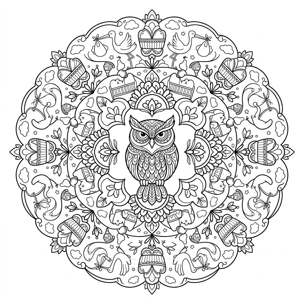Discover a world of intricate beauty with our Owl Mandala Baby Shower coloring page. At the heart of this radially symmetrical design sits a majestic owl, symbolizing wisdom and protection, adorned with delicate patterns. Surrounding this wise guardian, you'll find a delightful array of baby shower elements—graceful storks carrying precious bundles, cozy cradles, tiny rattles, and gentle clouds—all interwoven into a captivating tapestry of line art. Every detail, from the owl's feathers to the small stars, invites you into a serene coloring experience.