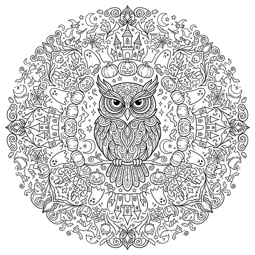 Prepare for a spellbinding coloring journey with this stunning Owl Mandala Halloween design. At its heart sits a majestic owl, its feathers intricately patterned, gazing out with knowing eyes. This radially symmetrical masterpiece unfolds outward from the wise owl, revealing a dense tapestry of classic Halloween motifs, from grinning jack-o'-lanterns and friendly ghosts to spooky haunted houses and swirling spiderwebs.