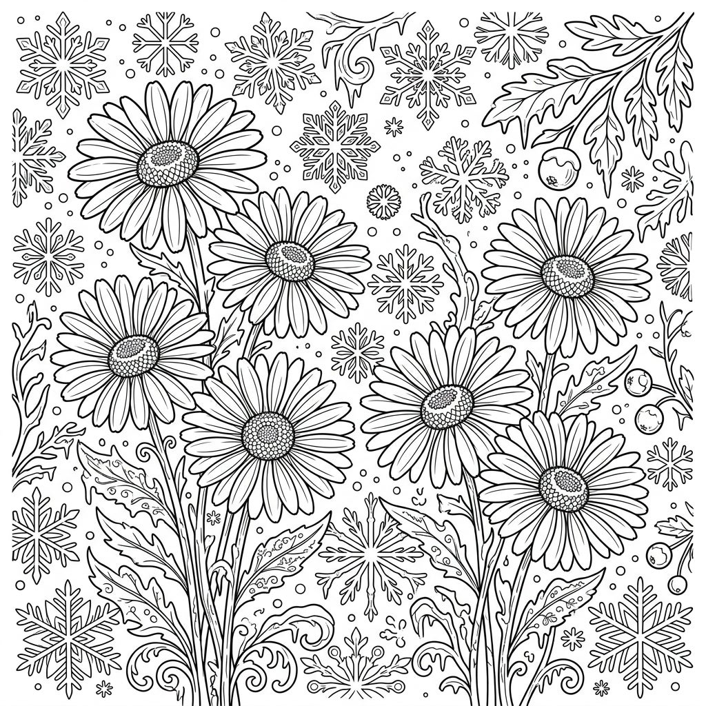 Embrace the unexpected beauty of winter with this enchanting Oxeye Daisies coloring page. Delicate blossoms mingle with intricate snowflakes, creating a unique and captivating scene ready for your creative touch.