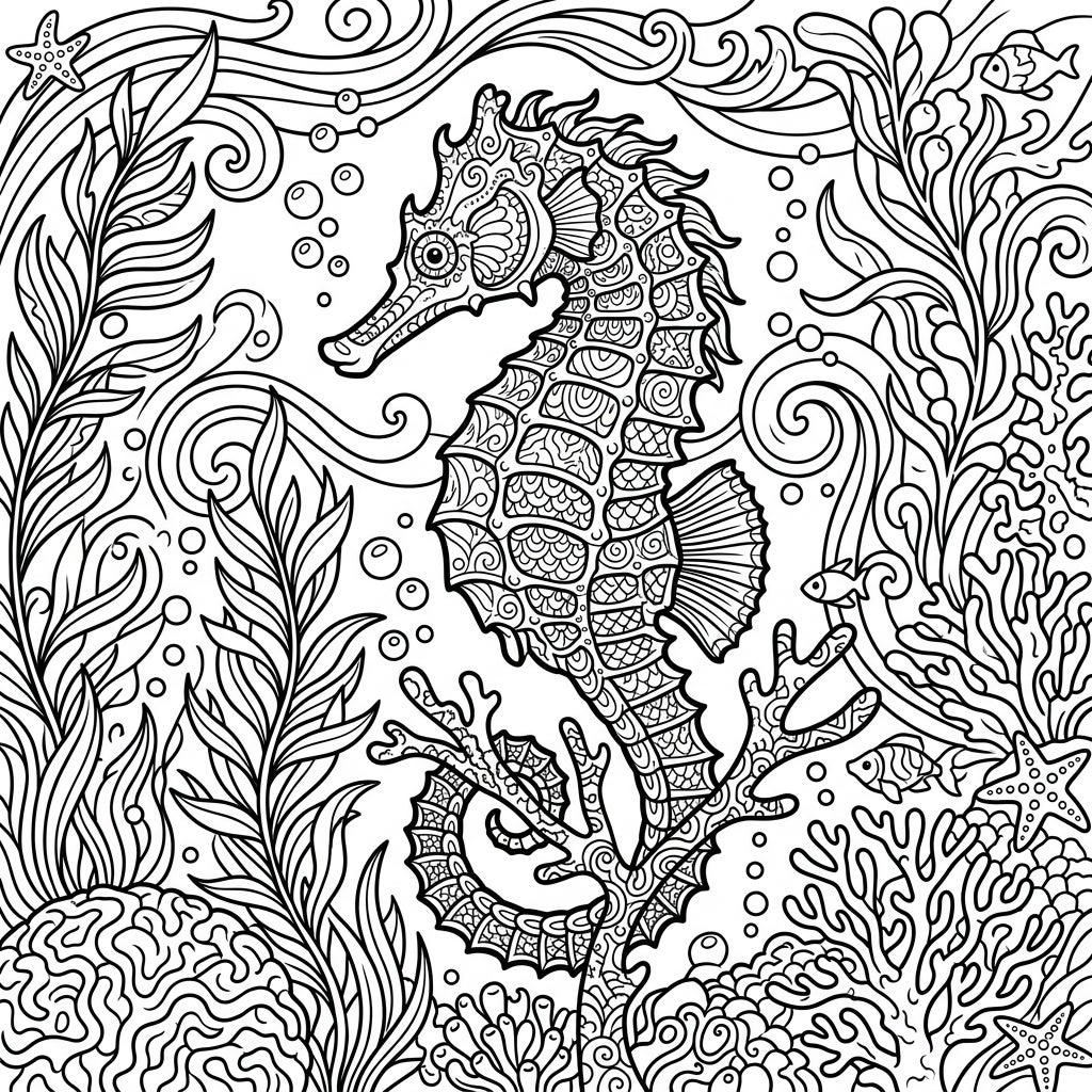 Delve into a mesmerizing oceanic tableau featuring a magnificent Painted Seahorse as its centerpiece. This stunning creature is adorned with an array of intricate, scale-like patterns, inviting you to bring its vibrant personality to life. It gracefully clings to a beautifully rendered piece of coral, while the surrounding waters teem with stylized bubbles, gentle swirling currents, and a rich variety of marine flora, including flowing sea plants and delicate coral formations. Look closely, and you'll even spot tiny fish and starfish adding to the bustling underwater ecosystem, creating a truly immersive scene.