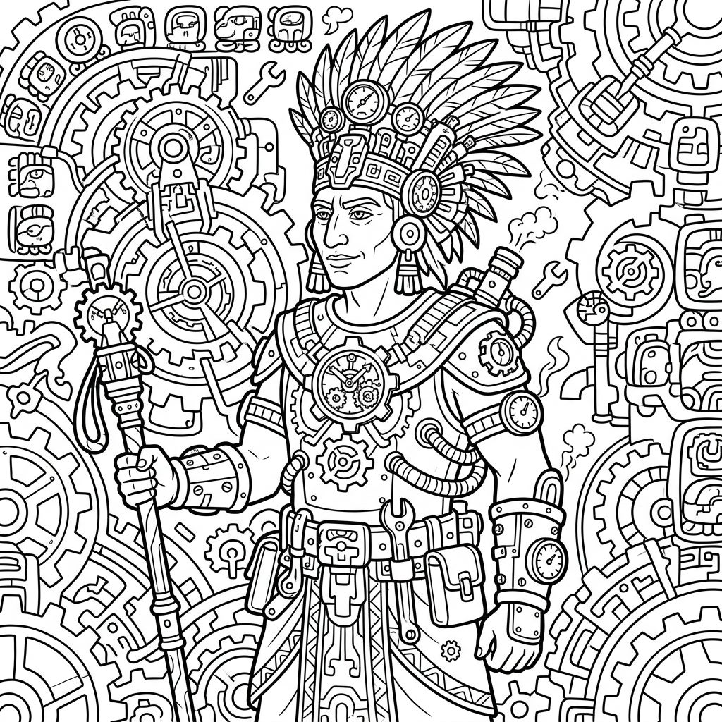 This coloring template transports you to an immersive world, blending the grandeur of the Mayan civilization with the gritty, imaginative flair of Steampunk. The background is a masterpiece in itself, a densely woven tapestry of clockwork patterns, interlocked gears, and authentic Mayan glyphs that demand your artistic attention. Feel the creative energy as you envision the metallic gleam of machinery against the ancient stone, or the gentle hiss of steam escaping from hidden conduits, bringing this extraordinary historical-fantasy hybrid to life with your chosen palette.