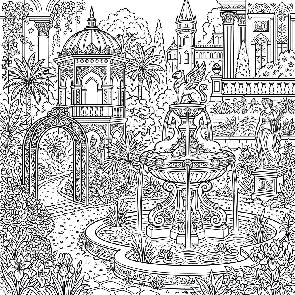 Embark on a creative journey through these magnificent palace gardens, meticulously designed for teen colorists. This intricate scene presents a captivating array of classical beauty, from the majestic central fountain crowned by a powerful griffin and spouting dolphins, to the serene lily pads floating in its basin. Discover the elegant domed gazebo with its delicate patterns, an inviting arched trellis, and classical statues that evoke a sense of timeless grandeur. Every corner of this illustration is filled with lush details, including various trees, flowering plants, and meticulously rendered architectural elements, offering a truly immersive coloring experience.