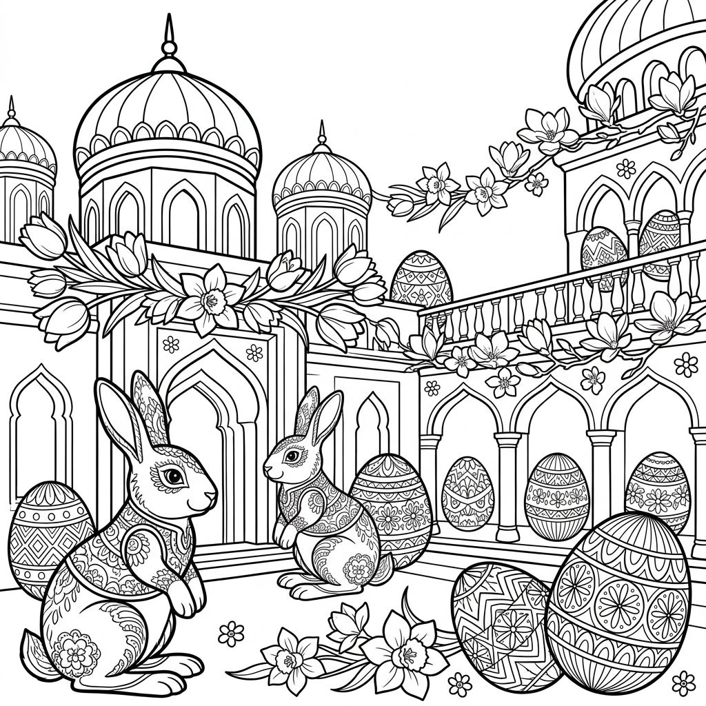 Immerse yourself in a beautiful Easter palace scene, designed with clear lines and comforting details. This intricate coloring template showcases two charming Easter bunnies, each adorned with elegant patterns, sitting amidst a collection of exquisitely decorated eggs. The grandeur of the palace, with its distinctive domes and graceful arches, is softened by abundant spring blossoms like tulips and daffodils, creating a harmonious blend of architectural beauty and festive nature.