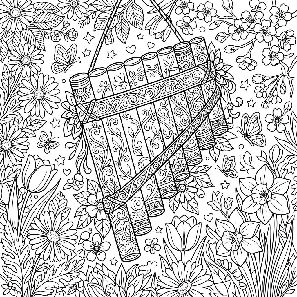 Celebrate the beauty of spring and music with this stunning adult coloring page featuring a highly detailed pan flute. Adorned with delicate patterns and surrounded by a lush floral garden, this design offers a truly immersive coloring experience.
