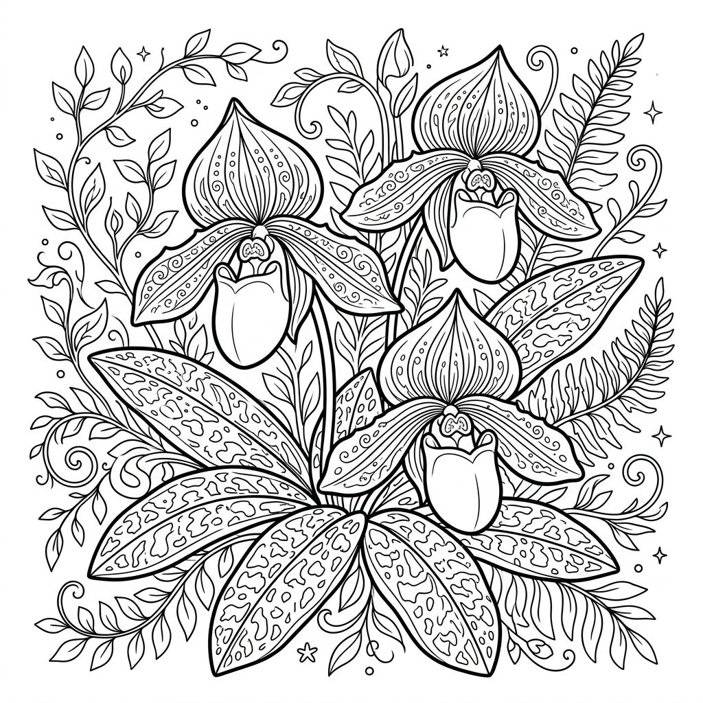 Dive into the enchanting world of Paphiopedilum Orchids, meticulously rendered in this intricate coloring page. Three majestic 'Slipper Orchids' take center stage, each boasting its signature pouch-like labellum and elaborately patterned petals. Observe the beautiful mottled texture on their broad leaves, a unique characteristic that adds depth and realism to the design. The artist has captured every delicate curve and internal pattern, promising a truly engaging coloring experience.