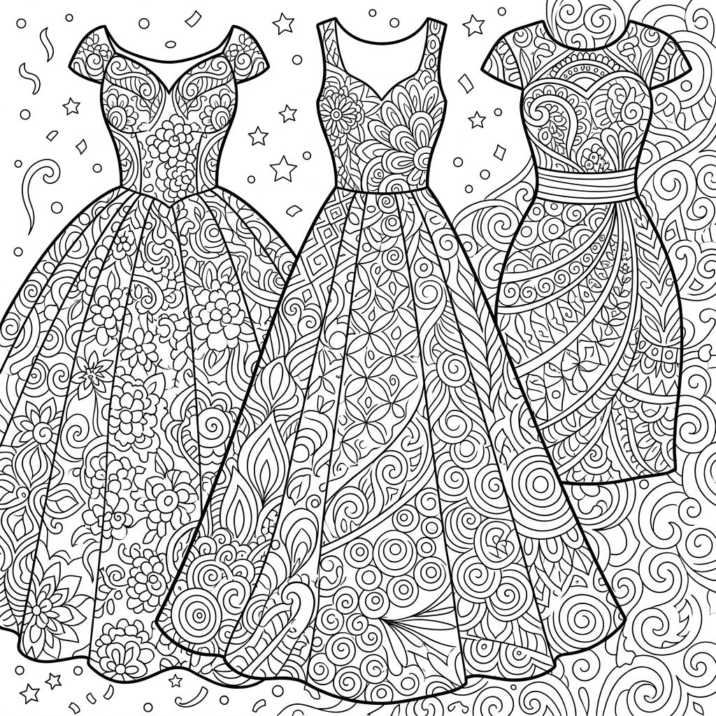 Envision yourself preparing for a grand celebration, a festive ball, or an elegant soirée as you bring these stunning party dresses to life with your chosen hues. This coloring page isn't just about fashion; it's an invitation to unwind and explore your creativity through the calming practice of Zentangle art. Each stroke of your pencil or marker will transform these detailed outlines into vibrant masterpieces, allowing you to relax and focus on the intricate beauty before you. It's the perfect activity to destress and indulge in a moment of artistic tranquility.