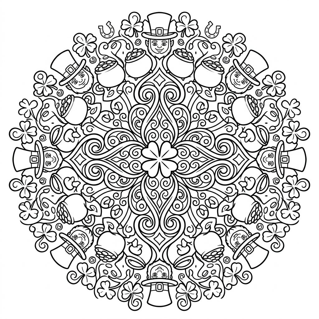 Step into a world of symmetrical wonder with our St. Patrick's Day Mandala coloring page. This intricate design unfolds from a central four-leaf clover, branching out into a mesmerizing pattern filled with iconic Irish symbols. Discover charming leprechaun faces peeking from under their top hats, glimmering pots of gold, lucky horseshoes, and an abundance of shamrocks, all woven into a dense, radial arrangement that promises hours of focused coloring.
