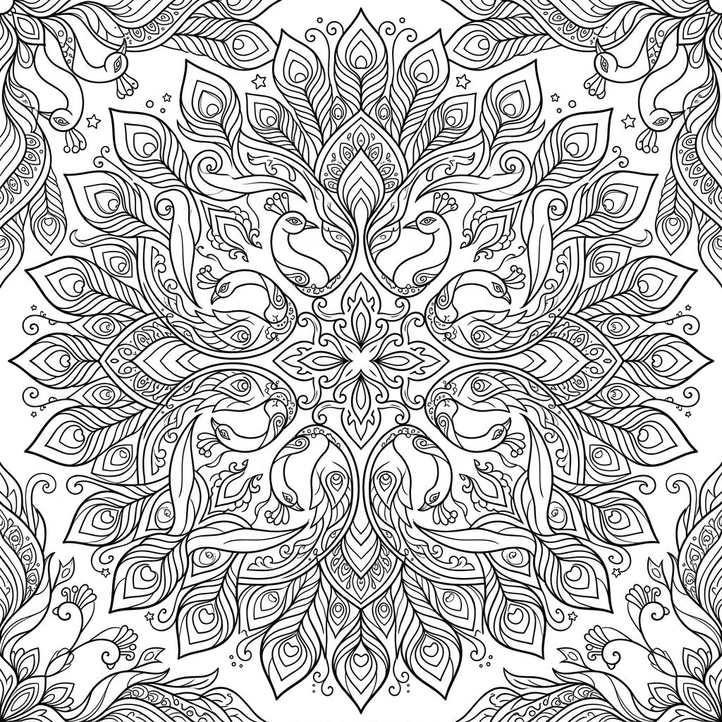 This elaborate mandala offers more than just a coloring activity; it's an invitation to a tranquil and reflective journey. As you fill each segment, you'll experience a sense of calm and focus, allowing the stresses of the day to melt away. The vibrant symbolism of peacocks, representing beauty, vision, and immortality, adds a deeper layer of meaning to your artistic meditation.