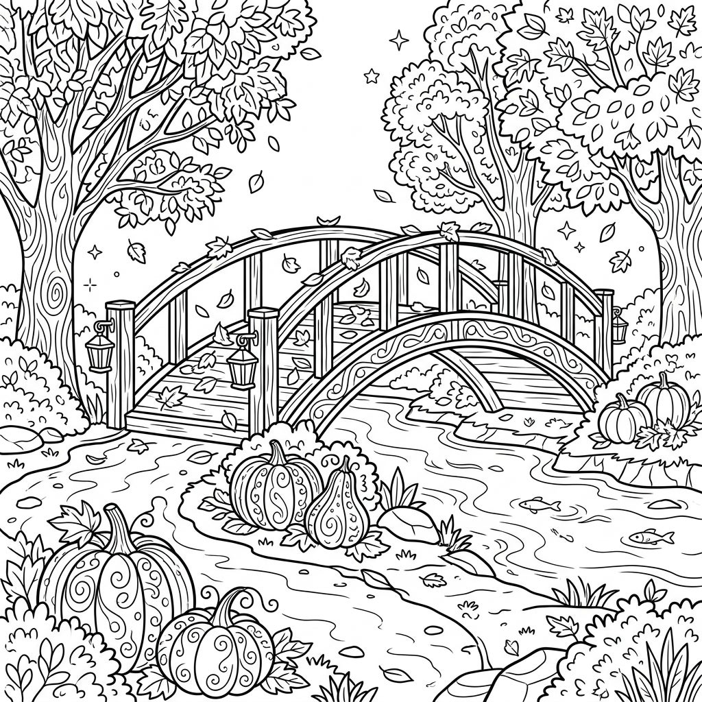 Step into a serene autumn landscape featuring a charming pedestrian bridge surrounded by the season's beauty. This intricate coloring page invites you to bring the vibrant hues of fall to life, from falling leaves to decorative pumpkins.