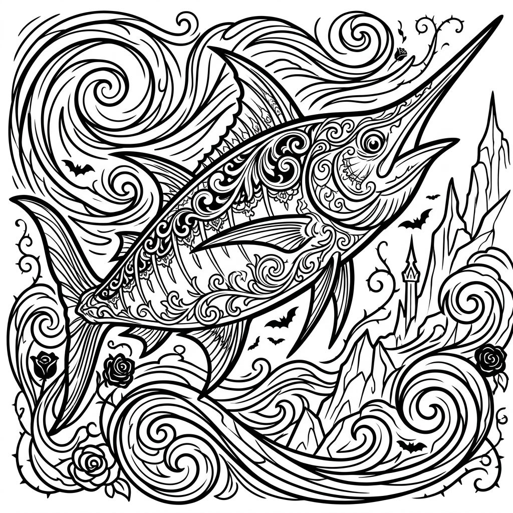 Plunge into a fascinating underwater world with this intricate Gothic Pelagic Fish coloring page. Dominating the scene is a majestic, marlin-like fish, its sleek body adorned with swirling, Victorian-inspired patterns and delicate lacework that evoke a sense of ancient mystery. The dynamic composition features dramatic, swirling waves and currents, creating a sense of powerful movement around the central creature. Look closely, and you'll discover thorny vines bearing darkly beautiful roses, fluttering bats, and even distant jagged mountains crowned with a foreboding gothic spire, all contributing to a truly immersive narrative.