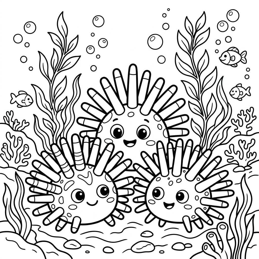 Explore the delightful depths of the ocean with this charming coloring page, featuring three super cute pencil urchins! Each urchin boasts a big, friendly smile and large, expressive eyes, surrounded by their characteristic thick, blunt spines. They're depicted in a lively underwater scene, nestled amongst flowing seaweed, whimsical bubbles, and intricate coral formations, creating a rich tableau just waiting for your artistic touch.