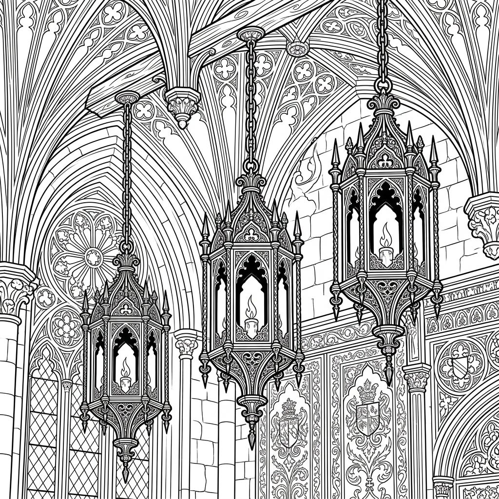 Unwind with this captivating coloring page featuring beautifully detailed Gothic pendant lights. Immerse yourself in a world of Victorian charm and intricate architectural artistry, ready for your creative touch.