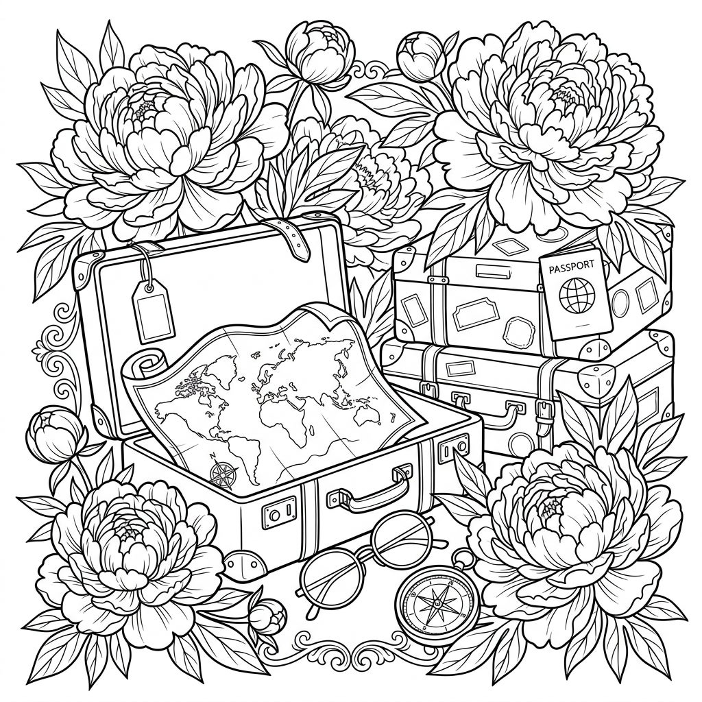 Unfold a world of beauty and adventure with this captivating coloring page featuring lush peonies and iconic travel elements. Immerse yourself in the intricate details of suitcases, maps, and blossoms, ready for your creative touch.