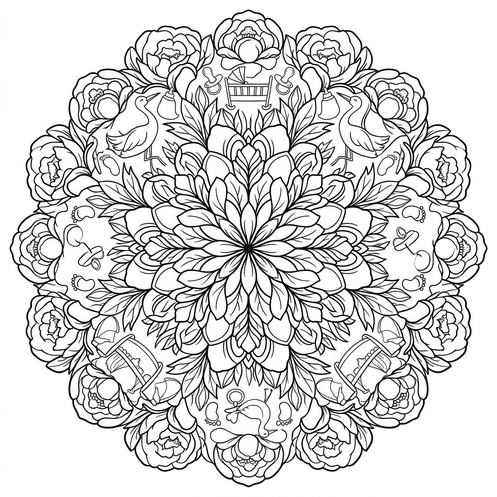 Immerse yourself in the delicate beauty of this Peony Mandala Baby Shower coloring template. This intricate design features a stunning radial symmetry, with full-blooming peony flowers forming a lush botanical backdrop. Nestled within these exquisite petals and leaves, you'll discover charming baby shower elements: graceful storks, cozy cradles, adorable pacifiers, tiny baby bottles, and sweet footprints, all meticulously integrated to create a harmonious and engaging scene.