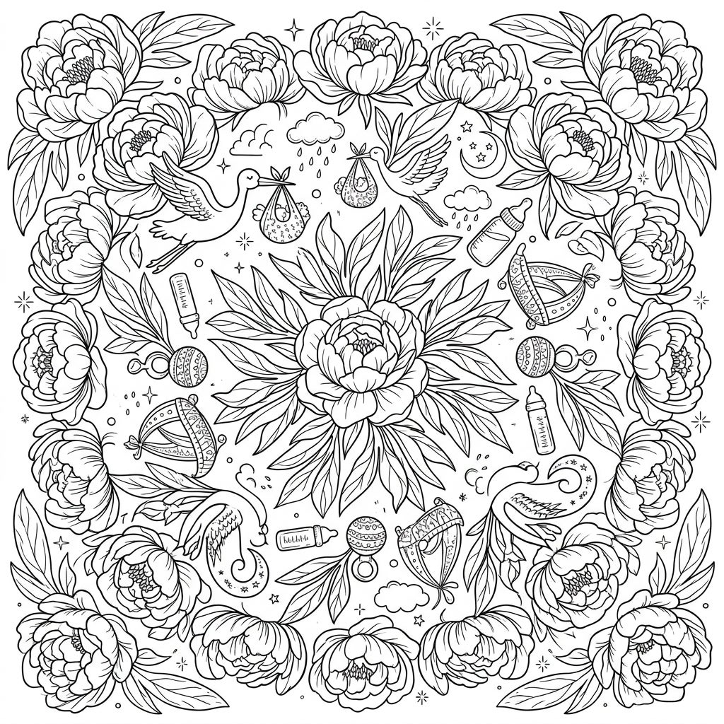 Discover a truly unique coloring experience with our Peony Mandala Baby Shower design. This intricate template showcases a mesmerizing, radially symmetrical arrangement of lush peony flowers, their petals unfurling in beautiful detail across the entire page. Nestled within this floral wonderland are charming baby shower elements: graceful storks soaring with precious bundles, delicate baby bottles, cheerful rattles, and cozy cradles, all rendered in a soft, minimalist line art style.