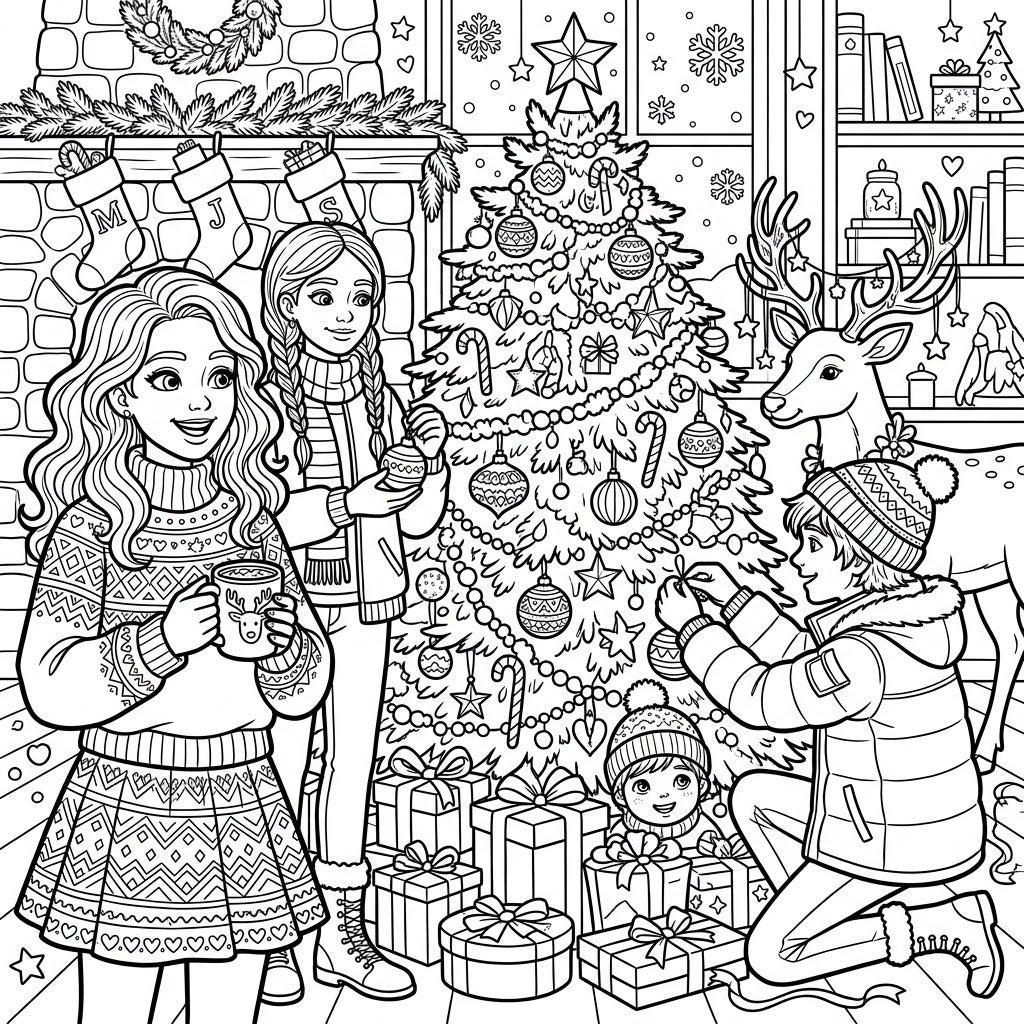 This captivating coloring page invites you into a cozy Christmas setting, where a family is busy bringing the holiday spirit to life. At the heart of the scene, a beautifully detailed Christmas tree stands tall, adorned with intricate ornaments, garlands, and candy canes, all waiting for your artistic touch. Around it, three cheerful teenagers and a small child are actively involved in the decorating process, each with expressive faces, flowing hair, and distinct festive clothing like cozy sweaters and winter jackets, adding depth and personality to the illustration.