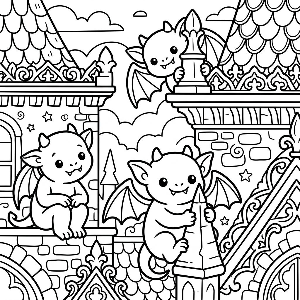 Let your imagination soar as you choose colors for these endearing characters and their grand surroundings. Will you give your gargoyles traditional stone hues, or surprise us with vibrant, fantastical shades? Experiment with rich jewel tones for the gothic architecture, or soft pastels for a dreamier effect. Don't forget the cloudy sky backdrop, which can be a canvas for serene blues or dramatic twilight colors, making each coloring session a truly personalized masterpiece.
