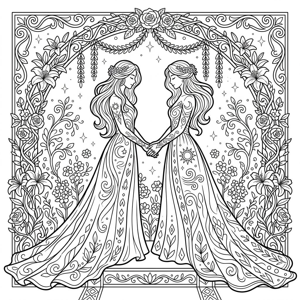 Step into a realm of ethereal beauty with our 'Personifications Wedding' coloring page, an exquisite linear art illustration designed for adult and teen colorists. This intricate design showcases two graceful figures, presumably personifications of love or destiny, holding hands under a magnificent floral arch. Their flowing wedding gowns are adorned with elaborate celestial motifs, including suns, moons, and stars, mirrored by intricate patterns on their arms. The arch itself is a masterpiece of roses, lilies, and swirling vines, creating a truly enchanting framework for this sacred union.