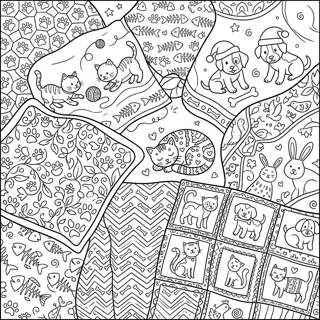 This captivating coloring page unfolds a patchwork of pet-themed blankets, each square bursting with intricate designs and lovable animal characters. Discover playful kittens pouncing on yarn, serene cats napping peacefully, and cheerful puppies, some even sporting festive Santa hats. The detailed patterns range from charming paw prints and fish bones to elegant floral motifs, providing a rich canvas for your artistic expression.