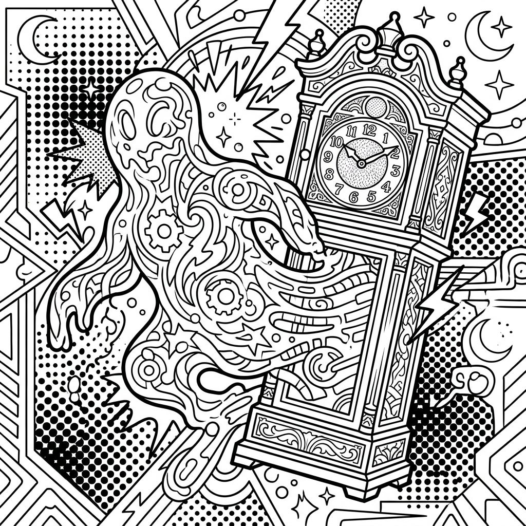Bring this Pop Art masterpiece to life with your favorite coloring tools. Experiment with contrasting colors to highlight the phantom's semi-corporeal nature against the solid structure of the clock. Use bold, saturated hues to amplify the Pop Art elements in the background, perhaps adding gradients or textured patterns within the halftone dots to create a truly unique effect. Let your imagination flow as freely as the phantom ooze itself!