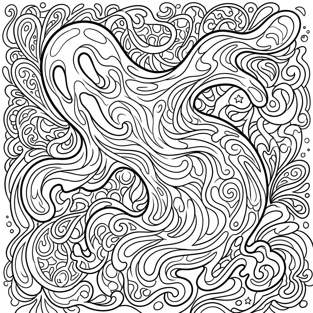 Ready to bring this psychedelic phantom ooze to life? Consider using a gradient technique within the larger ooze shape to emphasize its ethereal quality, perhaps transitioning from cool blues and greens to warm purples and pinks. For the intricate background swirls, vibrant contrasting colors will make the patterns pop, or you could opt for a monochrome palette with varying shades to create depth and texture. Don't be afraid to experiment with metallics or glitter pens to add a mystical shimmer. Let your intuition guide you as you transform these lines into a dazzling display of color!