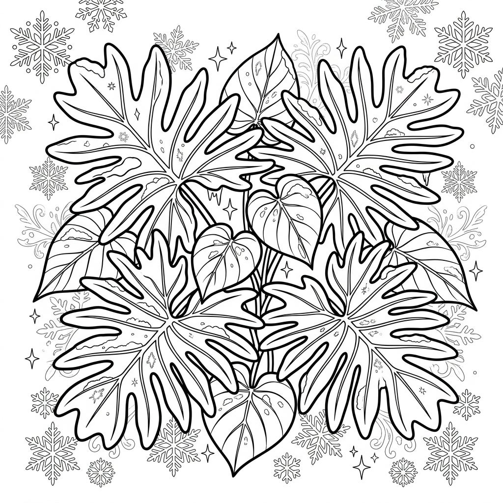 Unleash your creativity with this beautiful Philodendron leaf coloring page, adorned with a touch of winter magic. Discover intricate leaf patterns nestled among delicate snowflakes, ready for your colorful interpretation.