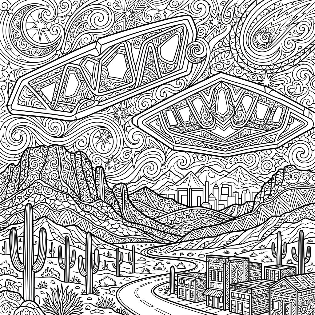 Prepare to immerse yourself in an extraordinary coloring experience with this highly detailed Phoenix Lights adult coloring page. Two magnificent, triangular UFOs dominate the upper sky, each intricately patterned and seemingly floating above a stunning desert panorama. Below, saguaro cacti stand tall amidst rolling hills and majestic mountains, while a winding road leads to a charming cluster of buildings and a distant city skyline, all rendered with an incredible level of complexity. The swirling, star-filled sky further enhances the fantastical and mysterious atmosphere of this captivating scene.