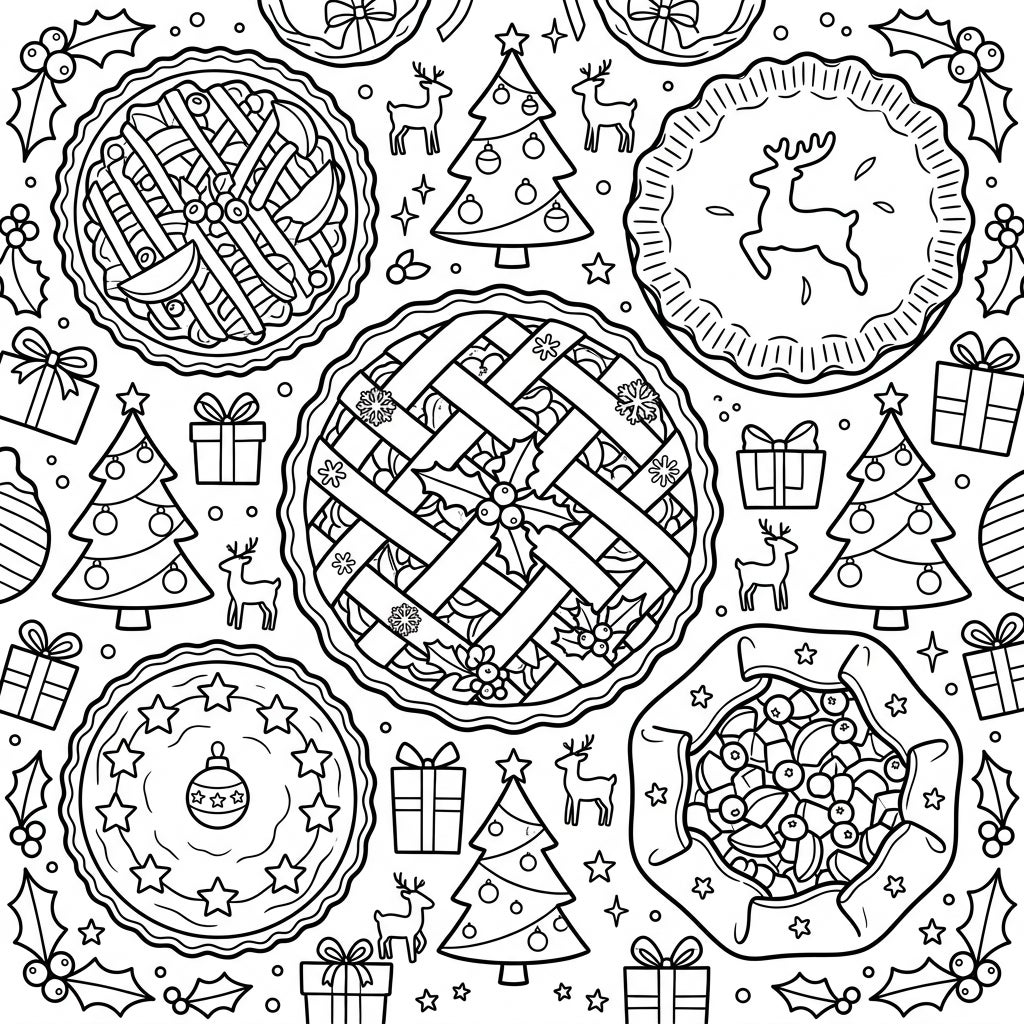 Unleash your creativity and bring this delicious Christmas scene to life with your favorite colors. Experiment with golden browns and rich reds for the pie crusts, and vibrant hues for the fruit fillings like cranberries, blueberries, or apples. Use classic festive colors like deep greens for the holly and trees, bright reds for berries and ribbons, and shimmering silvers or golds for ornaments and stars. Don't forget to add a personal touch to each element, making every pie and decoration uniquely yours.