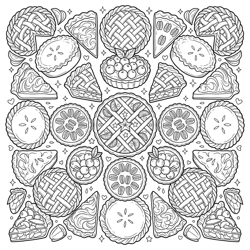More than just a coloring page, this mandala offers a meditative journey into the heart of comfort food. As you color each flaky crust and luscious filling, you'll feel the warmth and joy associated with home baking and festive gatherings. It's an opportunity to relax, unleash your creativity, and celebrate the simple pleasures of life, one beautifully colored dessert at a time.