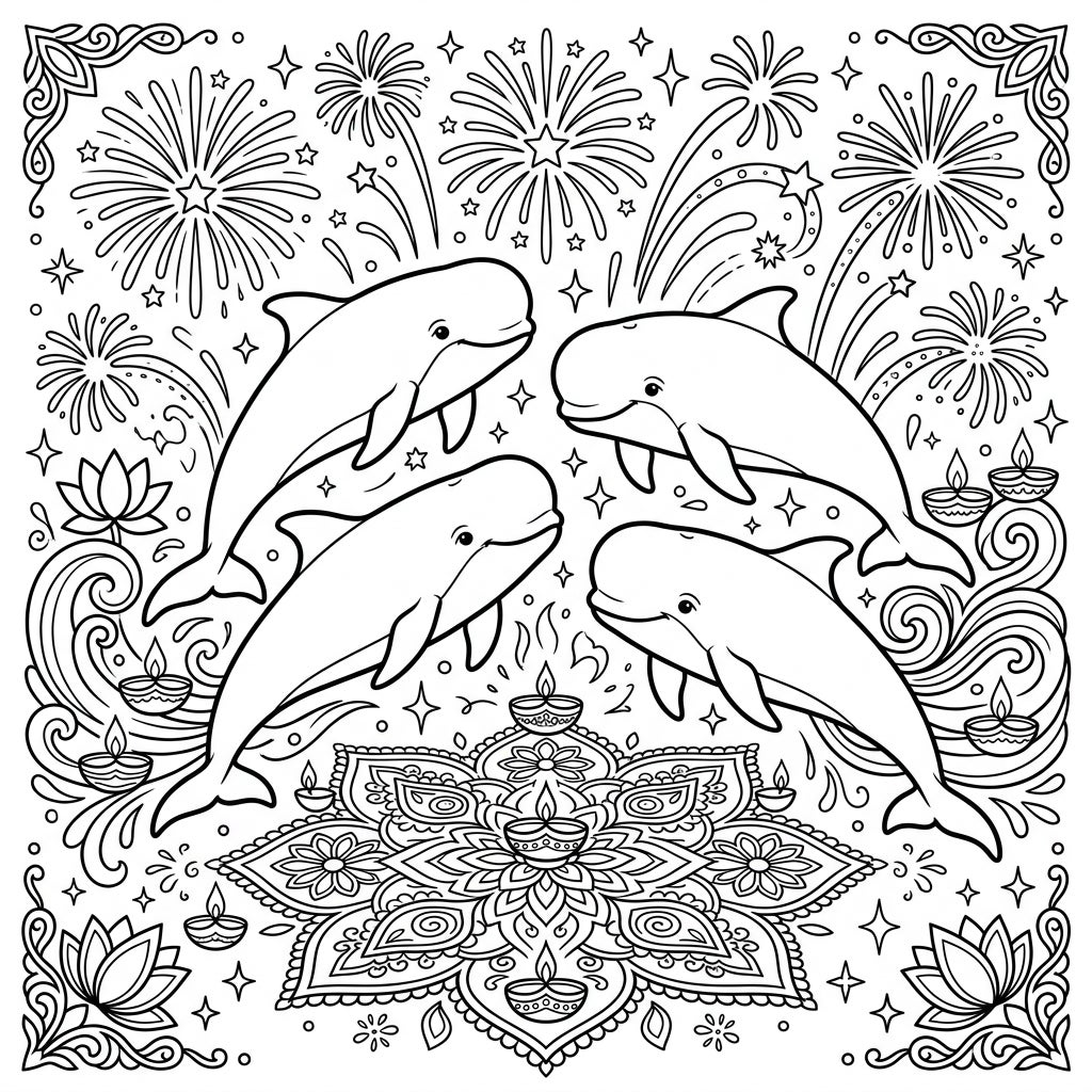 Dive into a spectacular fusion of marine wonder and festive cheer with this unique coloring page! Four adorable pilot whales, easily recognized by their distinctive bulbous foreheads, are depicted in a joyful pod formation, seemingly dancing amidst a grand Diwali celebration. The scene is meticulously crafted with symmetrical and radiant designs, featuring vibrant fireworks exploding in the background, intricate lotus blossoms, and traditional diyas (oil lamps) scattered throughout, creating a truly enchanting visual.