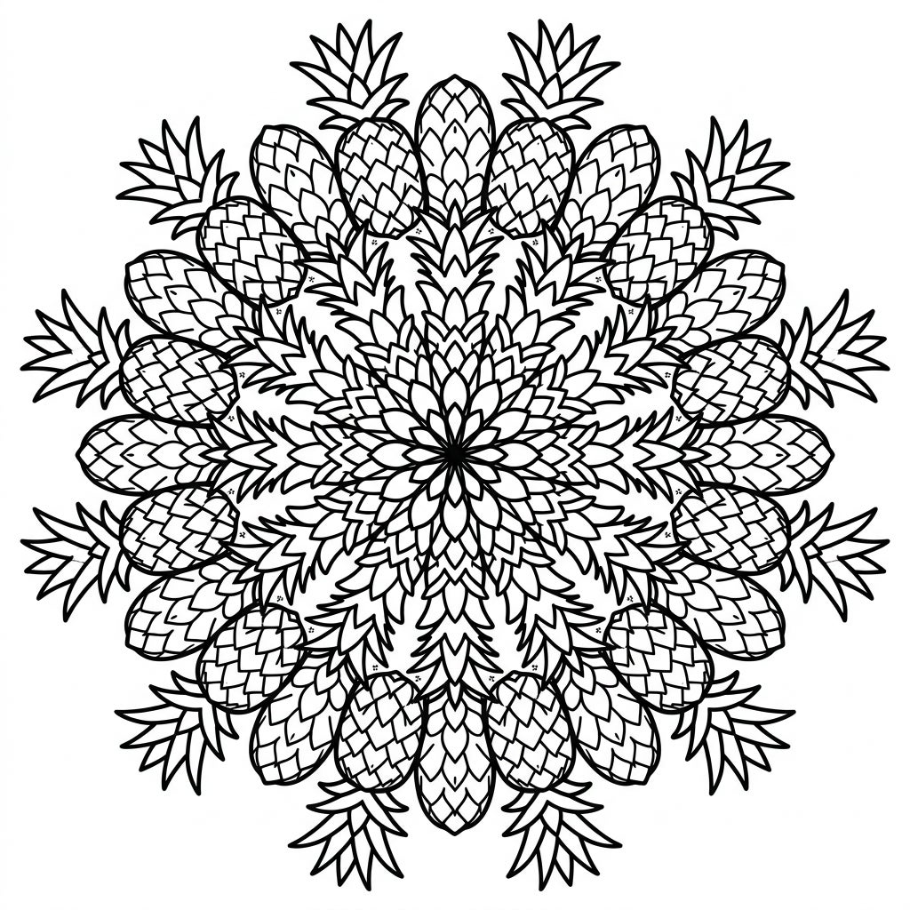 Discover a truly unique coloring experience with our exquisite Pineapple Mandala design. This intricate black and white template showcases a perfectly symmetrical radial pattern, where every element is a tropical pineapple. From the dense, complex core resembling a budding fruit to the outer rings formed by beautifully arranged individual pineapples complete with their spiky skins and leafy crowns, this design offers a rich tapestry of details waiting for your artistic touch.
