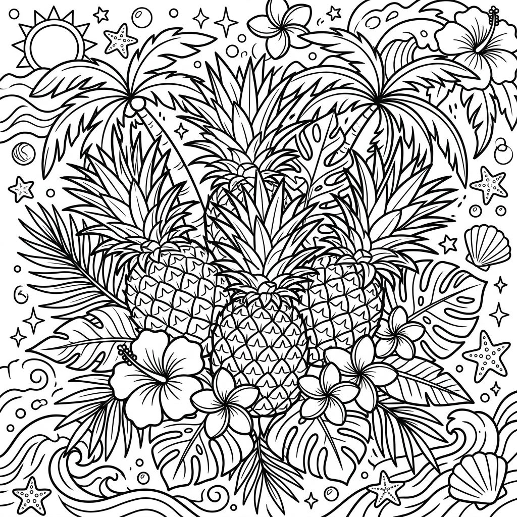 Unleash your creativity with a spectrum of summer colors! Imagine vibrant golden yellows and warm browns for the pineapples, lush greens for the tropical leaves, and brilliant reds, pinks, or whites for the flowers. Don't forget the azure blues for the ocean and bright yellow for the sun. Experiment with shading to add depth to the pineapple textures and make the whole scene pop, creating your very own masterpiece of tropical delight.