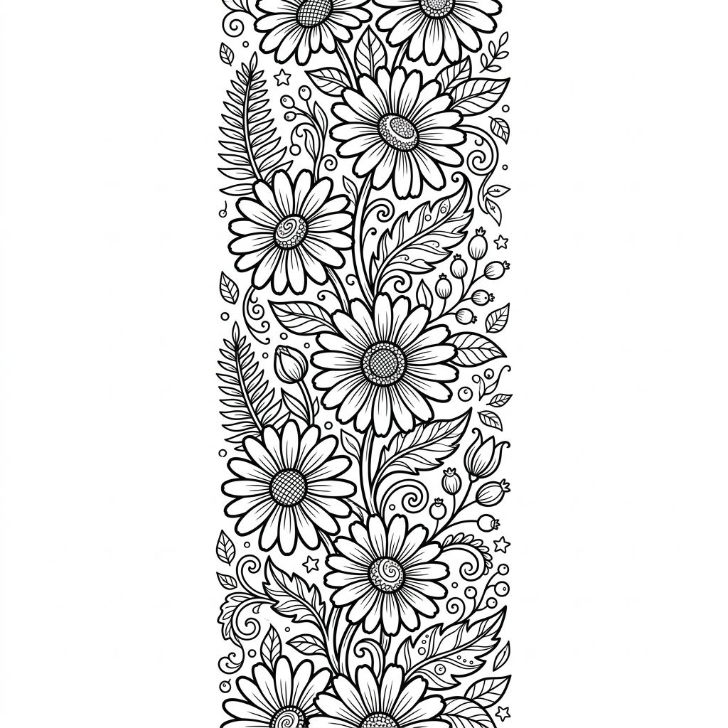 Immerse yourself in the delicate artistry of this intricate coloring template, specifically designed as a beautiful bookmark. This vertical composition bursts with cheerful daisies, each petal outlined with precision, surrounded by a tapestry of swirling leaves, delicate berries, and tiny decorative stars. Every element is meticulously crafted, offering a rich and engaging canvas for your creative expression, making it a joy to bring to life with your favorite hues.