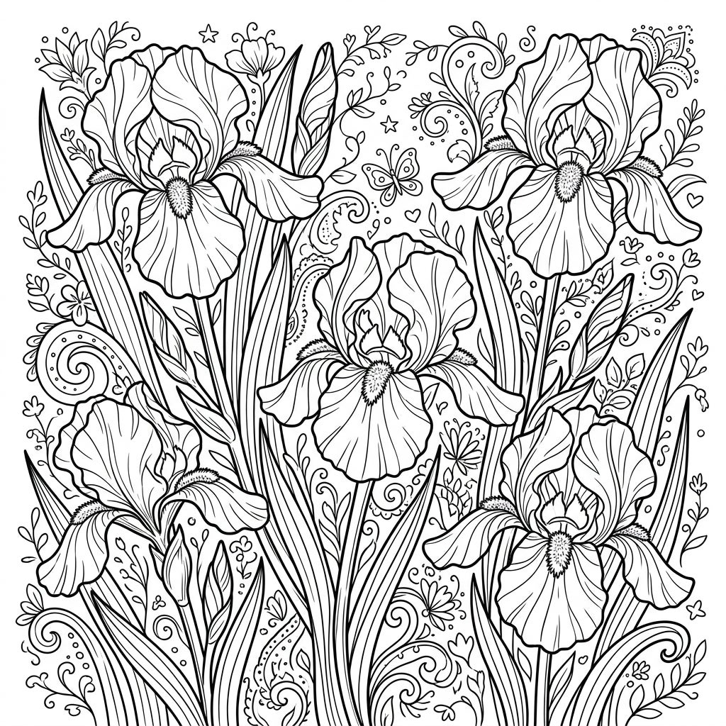 Immerse yourself in a lush floral scene featuring several majestic iris flowers, each with beautifully rendered petals and prominent long leaves. The entire page is a tapestry of intricate line art, with a captivating background filled with delicate swirling vines, tiny leaves, playful dots, and even a hidden butterfly and charming hearts, offering a truly immersive coloring experience. This design balances prominence for the main flowers with rich, supportive details that fill every corner.
