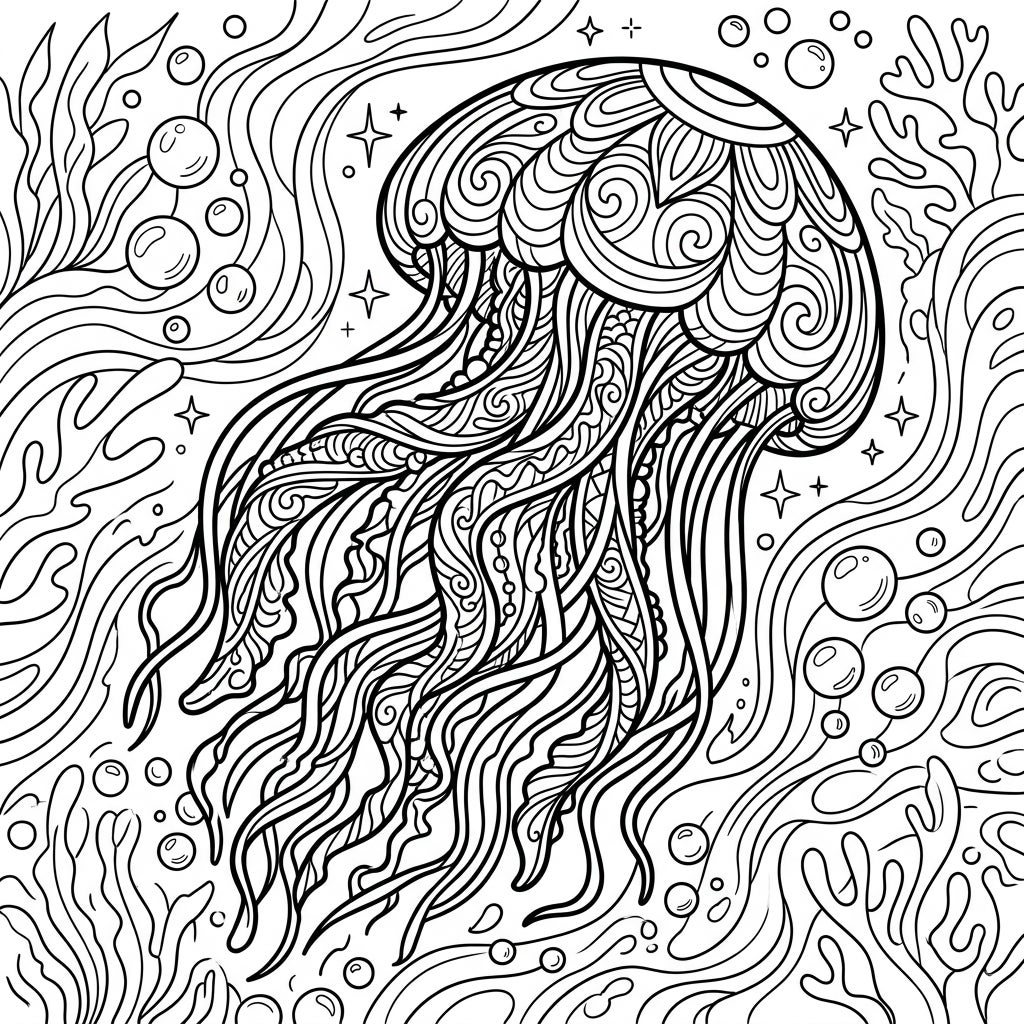 Immerse yourself in the intricate world beneath the waves with our stunning Pink Meanies Jellyfish coloring page. This design showcases a magnificent jellyfish, its bell adorned with elegant swirls and patterns that invite careful attention. A multitude of long, flowing tentacles cascade downwards, each line intricately detailed with unique textures and decorative elements, creating a visually rich tapestry. The entire creature is set against a dynamic backdrop of wavy marine flora, various sizes of shimmering bubbles, and delicate star-like motifs, ensuring every inch of the page offers a satisfying coloring challenge.