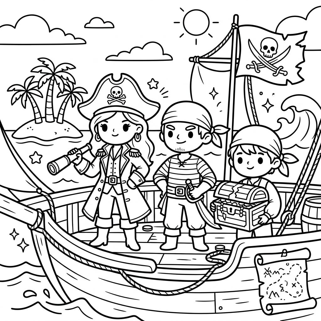 Embark on an exciting coloring quest with this charming pirate ship scene, featuring three eager young buccaneers ready for adventure. Designed especially for kids, this page promises hours of creative fun as they bring the high seas to life with color.