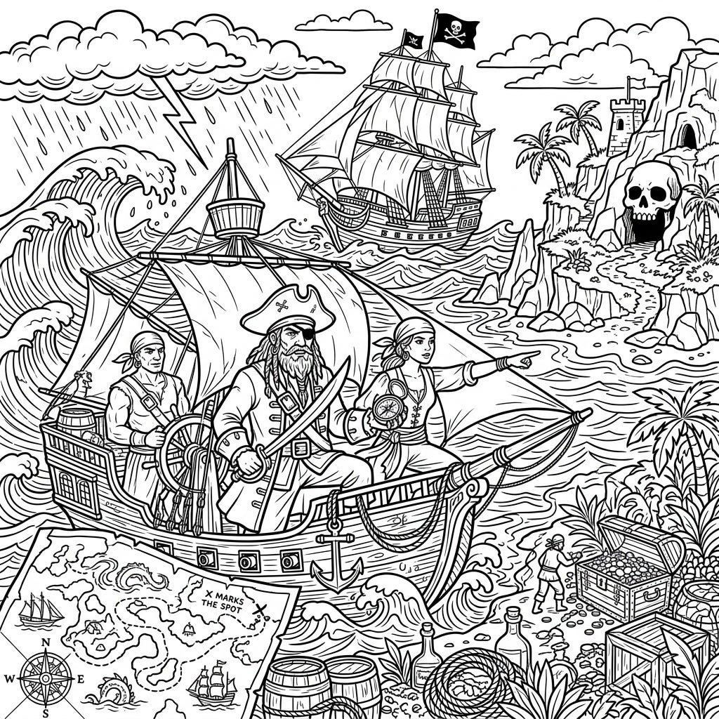 Unfurl your creativity with this epic pirate coloring page, teeming with high-seas excitement and hidden treasures! This intricate illustration captures a dramatic moment on the open ocean, featuring a brave crew – a seasoned captain with an eye patch, a steady helmsman, and a keen-eyed navigator – battling stormy waves under a lightning-streaked sky. In the background, a grand pirate galleon sails forth, while a detailed treasure island beckons with its skull cave, swaying palm trees, and a lone buccaneer uncovering a chest overflowing with gold.