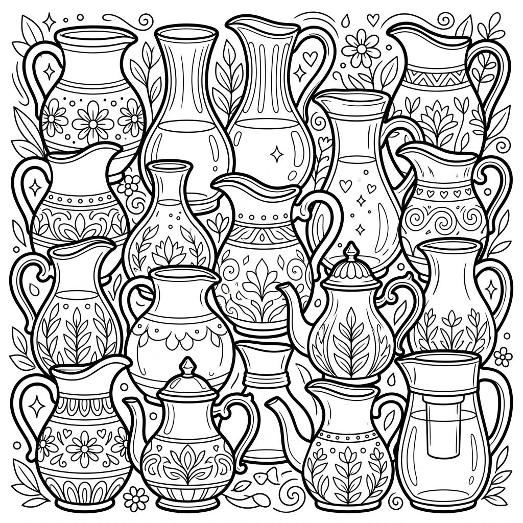 Get ready for a fascinating coloring journey with our 'Pitchers & Carafes' page, packed with an array of beautiful vessels waiting for your artistic touch. This intricate design showcases a delightful mix of pitchers, elegant carafes, and charming teapots, each boasting unique patterns from delicate florals and swirling leaves to classic geometric shapes. Every corner of the page is filled with engaging details like tiny hearts, stars, and leafy tendrils, creating a rich and immersive scene perfect for hours of creative fun.