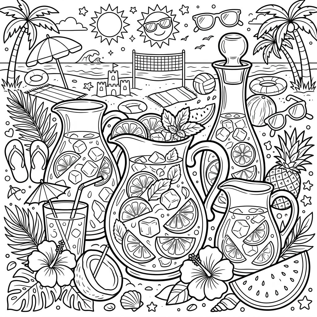 This intricate coloring page invites you to a bustling summer beach scene, dominated by an inviting collection of pitchers and carafes. Each vessel overflows with the promise of cool refreshment, visibly chilled with ice cubes and garnished generously with slices of citrus fruits like lemons and oranges, along with sprigs of fresh mint. Surrounding these delightful drink containers are a bounty of tropical treasures: lush hibiscus flowers, broad palm fronds, a juicy pineapple, a slice of watermelon, and halves of coconut, creating a feast for the eyes and a rich canvas for your colors.