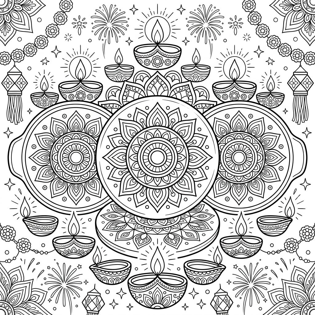 Immerse yourself in the vibrant spirit of Diwali with this beautifully intricate coloring page. Featuring elaborate rangoli patterns on decorative plates, glowing diyas, and festive fireworks, it's perfect for celebrating the Festival of Lights.