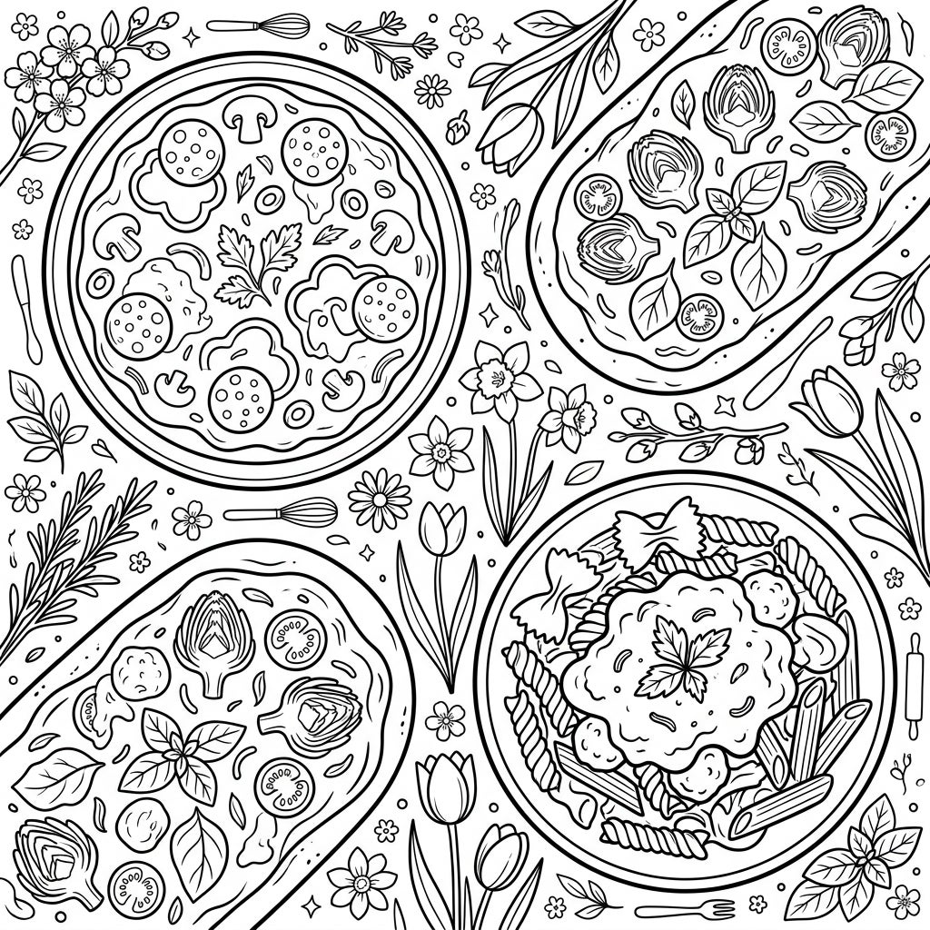 Unleash your creativity and bring this delicious spring scene to life with your favorite colors! Consider vibrant reds and oranges for the pepperoni and tomatoes, golden yellows for melted cheese, and earthy browns for mushrooms. For the pasta, explore a palette of rich reds for sauces, and a variety of greens for fresh herbs. The spring flowers offer a wonderful opportunity to use cheerful pinks, sunny yellows, soft purples, and sky blues. Experiment with shading to give depth to the ingredients and textures, making each bite and petal pop with irresistible charm. Grab your pencils or markers and let the spring feast begin!